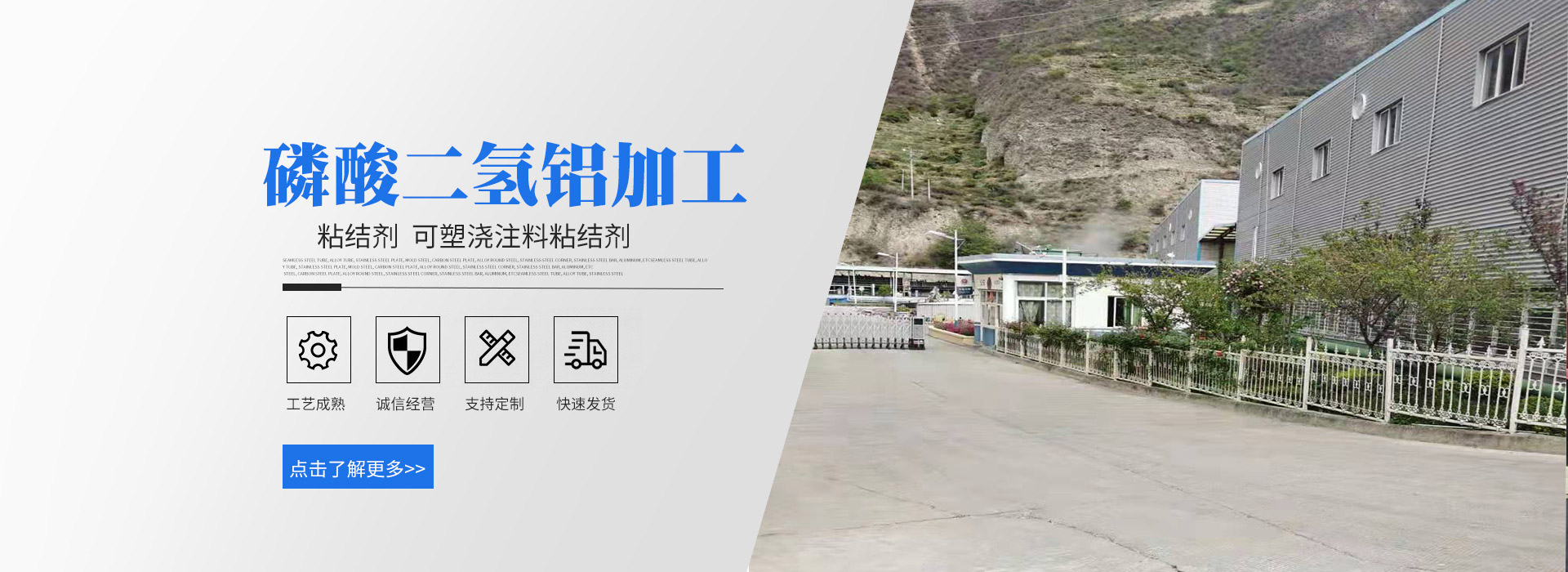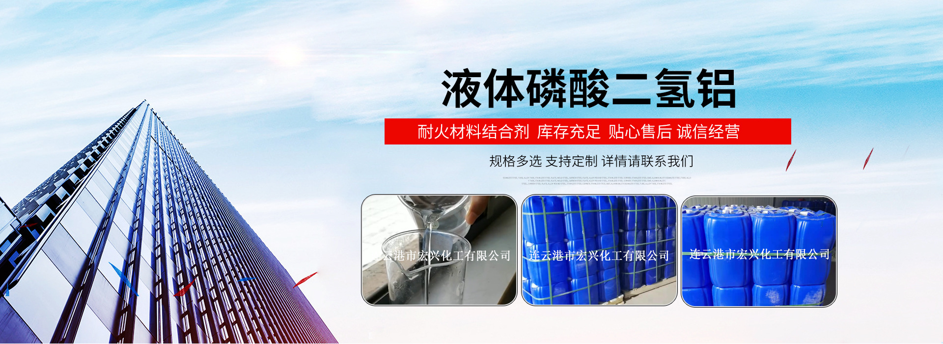 您好,歡迎來到連云港市宏興化工有限公司網站!我們為您提供磷酸二氫鋁液體、磷酸二氫鋁結合劑、耐高溫粘結劑等產品及服務。